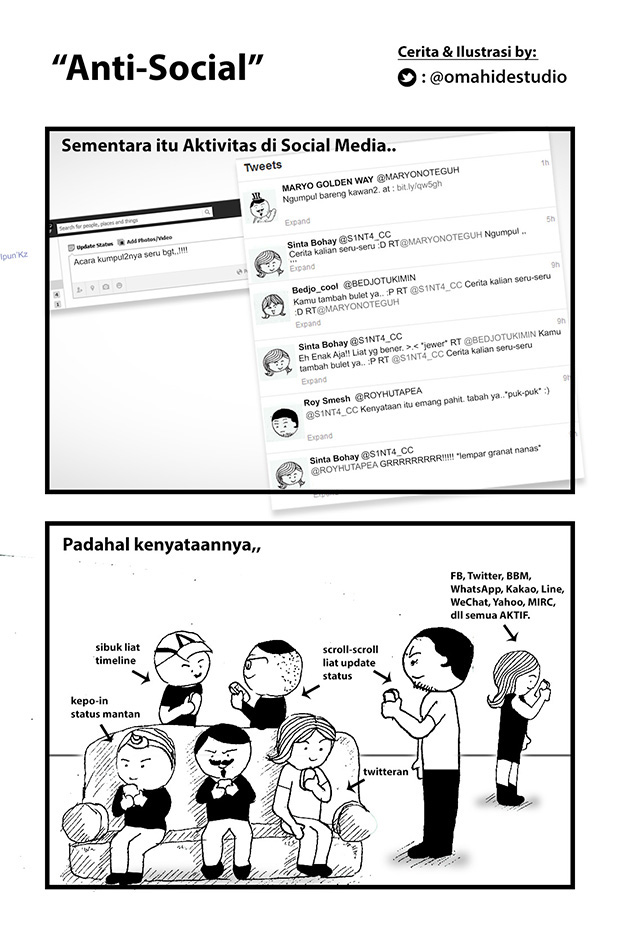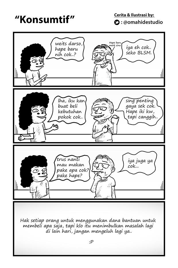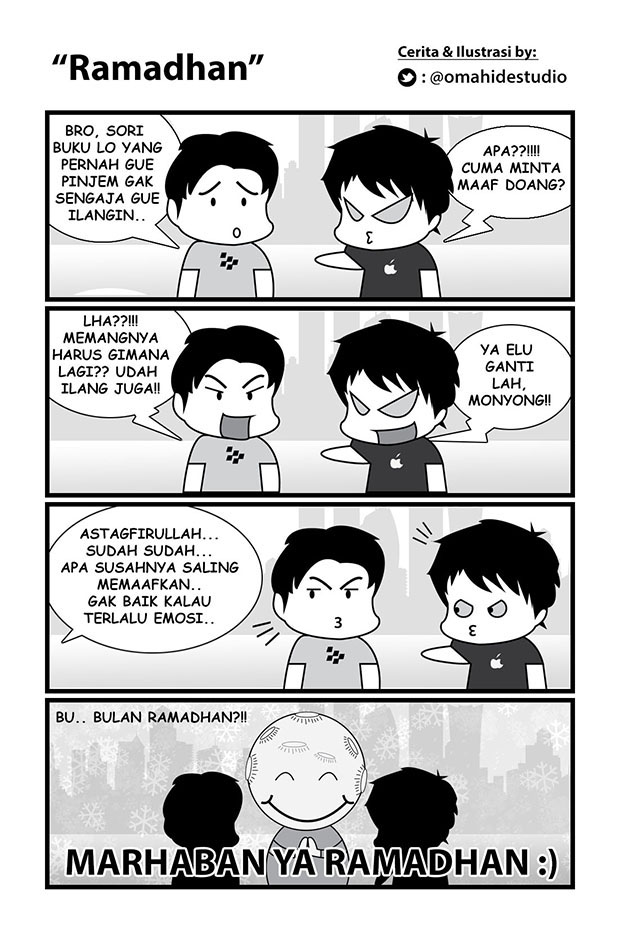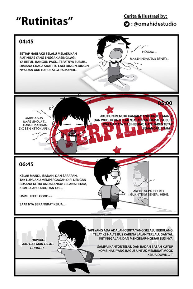 Komik ini Menceritakan empat cerita yang berbeda, dan disajikan dengan dua gaya yang berbeda (melalui manual dan digital). Cerita Rutinitas bangun pagi yang berujung telat, Cerita Penyalahgunaan BLSM oleh masyarakat, Cerita Sok eksis di socialmedia padahal kenyataannya sibuk sama gadget sendiri, dan cerita pentingnya gak make emosi dalam menyambut bulan suci.