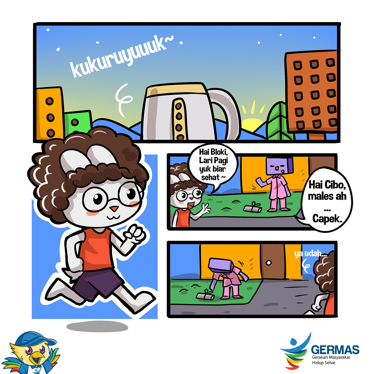 Ngapain sih lari pagi - lari pagi segala, kan capek... Nah di komik pendek 2 halaman ini saya ingin memberi tahu akibat dari malas lari pagi dan juga manfaat dari lari pagi. Karakter2 yang saya buat di komik ini terinspirasi dari karakter Cican nya mas Wahyu Aditya. Nama karakter yang dipakai adalah Cibo (kelinCI kriBO) dan Bloki yang merupakan dua sahabat baik.